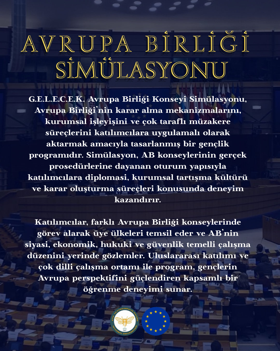 G.E.L.E.C.E.K. Avrupa Birliği Konseyi Simülasyonu, Avrupa Birliği’nin karar alma mekanizmalarını, kurumsal işleyişini ve çok taraflı müzakere süreçlerini katılımcılara uygulamalı olarak aktarmak amacıyla tasarlanmış bir gençlik programıdır. Simülasyon, AB konseylerinin gerçek prosedürlerine dayanan oturum yapısıyla katılımcılara diplomasi, kurumsal tartışma kültürü ve karar oluşturma süreçleri konusunda deneyim kazandırır.